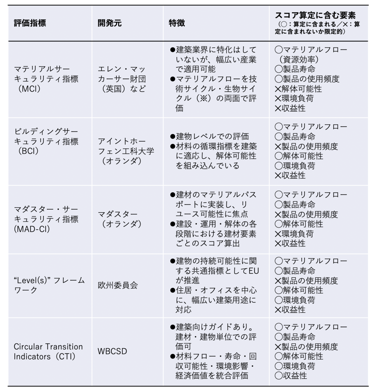 主な評価指標の特徴は下の表を参照されたい。マテリアルフローや建築・建材寿命は多くの指標で重視される一方、解体可能性・使用頻度・環境負荷などは扱いが分かれる。特に収益性まで組み込む例は少なく、WBCSDのCTIはその先駆けといえる。