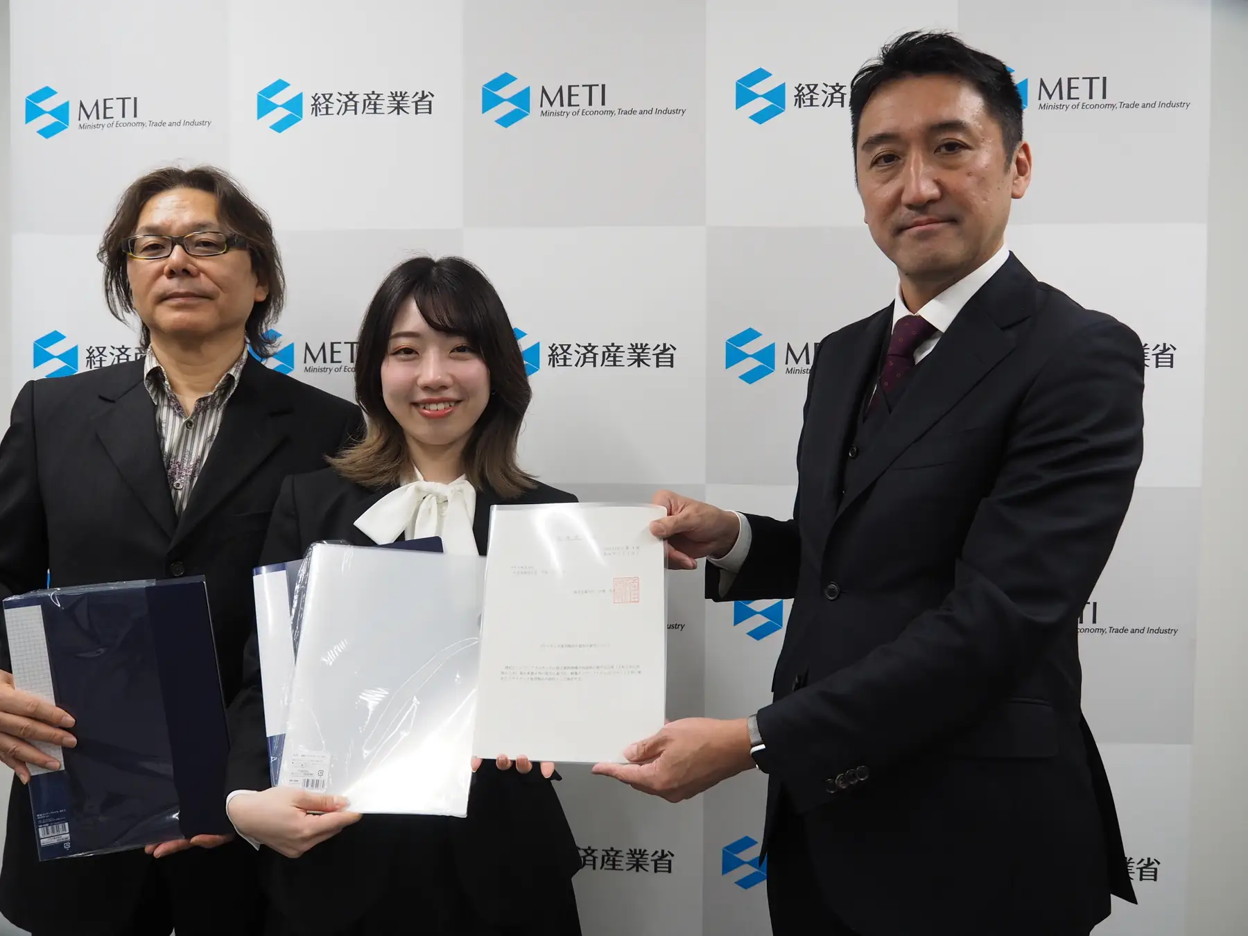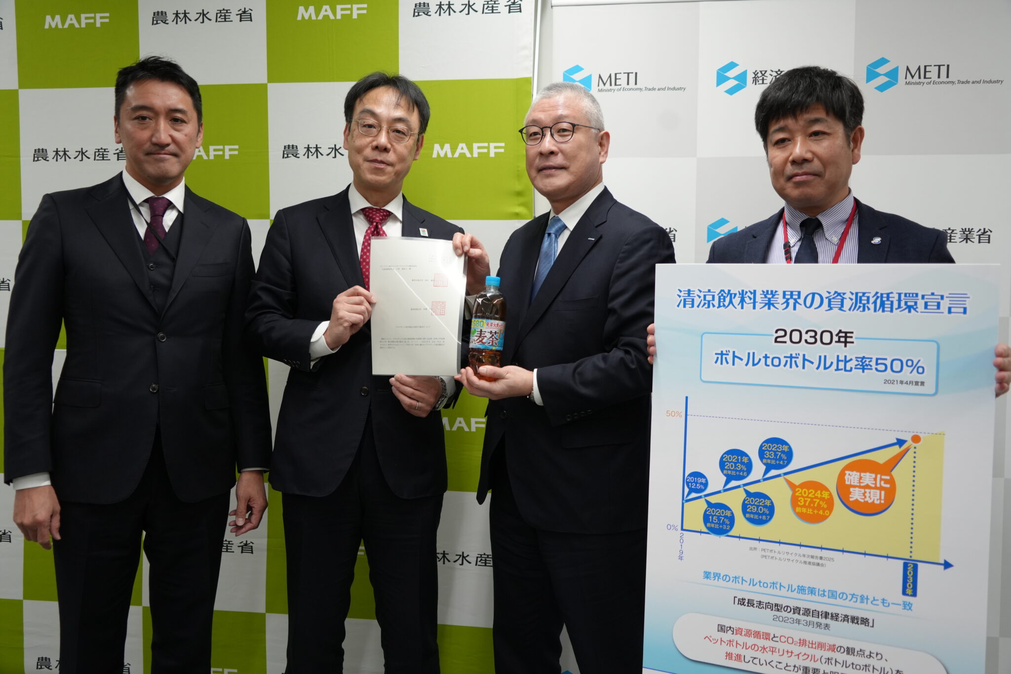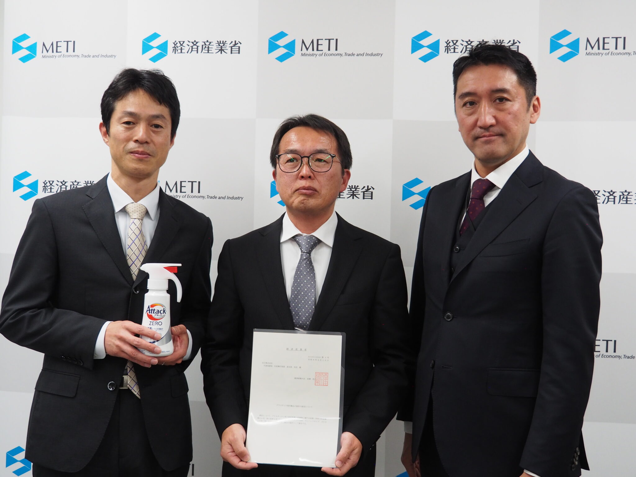 清涼飲料用ペットボトル容器分野は農林水産省と経済産業省の共管で、同分野では18件が認定された。文具、家庭用洗浄剤容器、家庭用化粧品容器の3分野については経済産業省が単独で認定を行った。同日、各分野の第1号認定を取得した4事業者に対し、経済産業省内で両省から認定証が手交された。