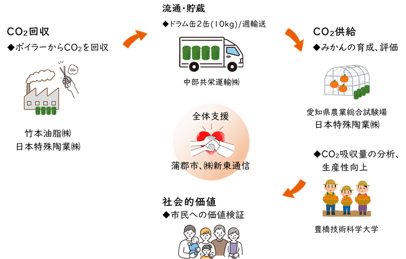 同プロジェクトでは、竹本油脂の亀岩工場から排出されるCO₂を、日本特殊陶業の持つ回収技術で流通用ドラム缶に回収し、中部共栄運輸が愛知県農業総合試験場園芸研究部常緑果樹研究室に輸送する。輸送されたCO₂は、ハウスみかんの成長促進用のガスとして実証実験に再活用される。