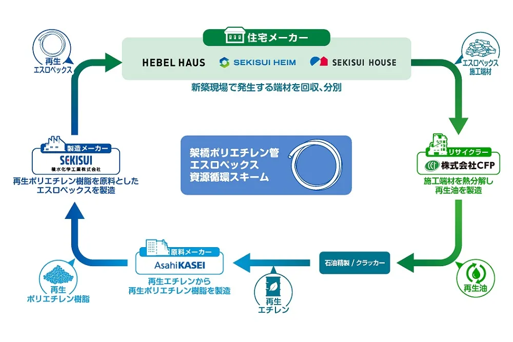 このスキームの対象となるのは、積水化学工業が製造する架橋ポリエチレン管「エスロペックス」だ。耐熱性や耐久性に優れることから、多くの住宅で給水・給湯配管として使用されている。今回の取り組みでは、まずプレハブ住宅メーカーである旭化成ホームズ、積水化学(住宅カンパニー)、積水ハウスの3社が、建築現場で発生する施工端材を回収する。その後、ケミカルリサイクルを手がけるCFPが回収された端材を化学的に分解して再生油を製造。この再生油から生成された再生エチレンを元に旭化成が再生ポリエチレン樹脂を製造し、再び積水化学が「再生エスロペックス」として製品化する流れだ。