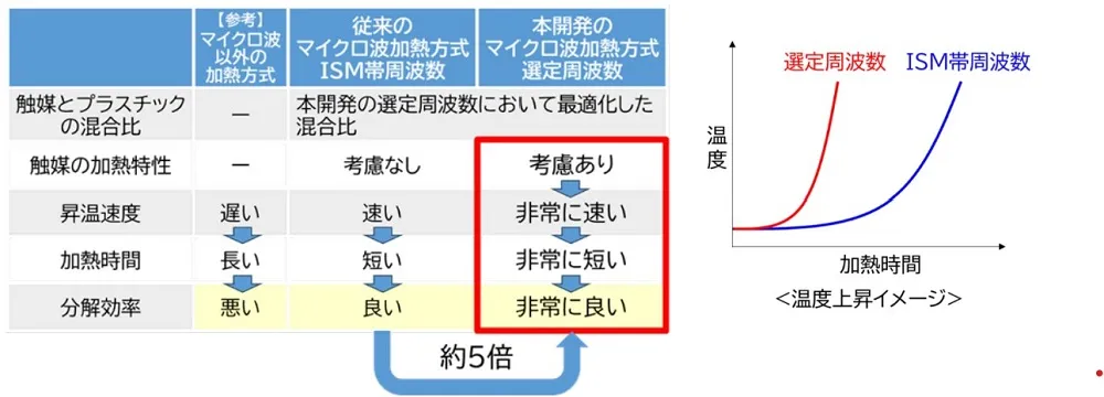 今回、三菱電機はまず、マイクロ波の周波数によって触媒の加熱効率が異なる特性を測定し、ISM帯よりも加熱効率が高い10GHz程度の高周波数を選定した。これにより昇温速度が速まり、加熱時間を短縮できる。さらに、実験的検証に基づきプラスチックと触媒の混合比を最適化することで、分解効率を最大化する技術を確立した。同社の比較によると、これらの技術により分解効率は従来のISM帯を用いた方式の約5倍に向上したという。