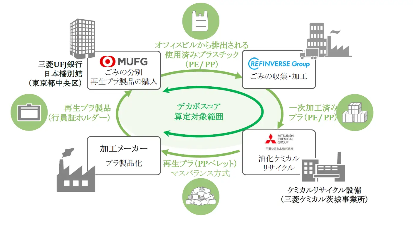 三菱UFJ銀行、三菱ケミカル、リファインバースグループの3社は、オフィスから排出される使用済みプラスチックの資源循環に向けた取り組みで覚書を締結したと発表した。